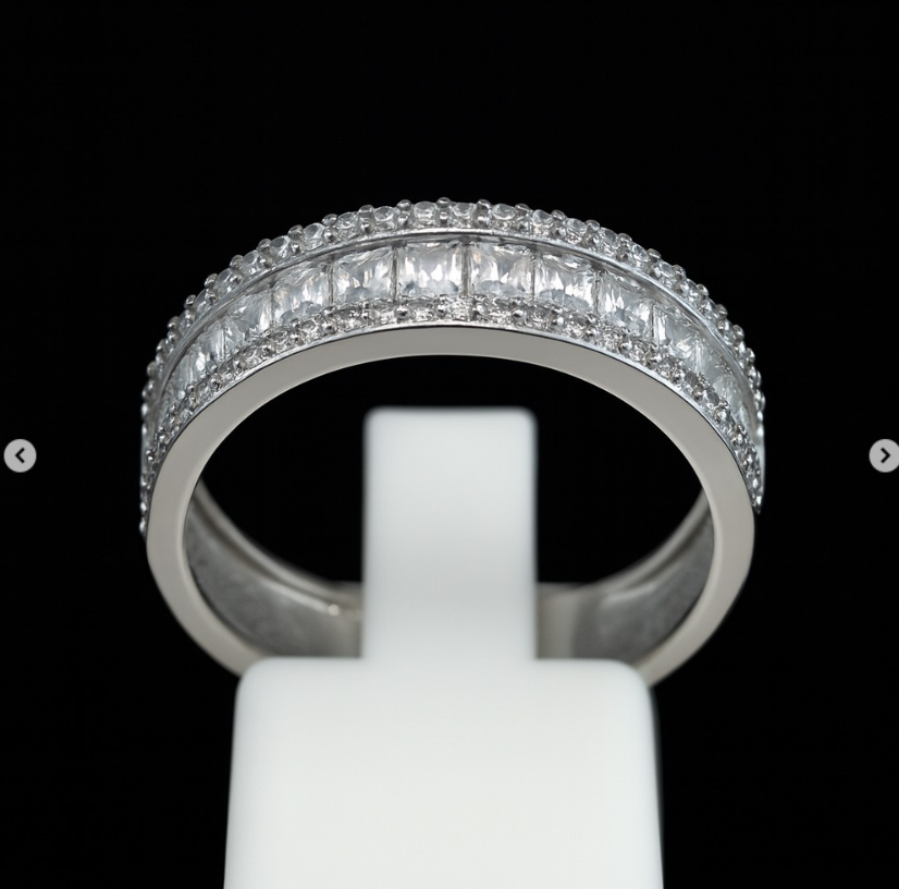 Crafted from hallmarked 925 silver and coated with rhodium plating to resist tarnishing, this ring blends timeless beauty with modern glamour. The wide band gives a bold yet refined look — ideal for weddings, anniversaries, or a luxury everyday style.